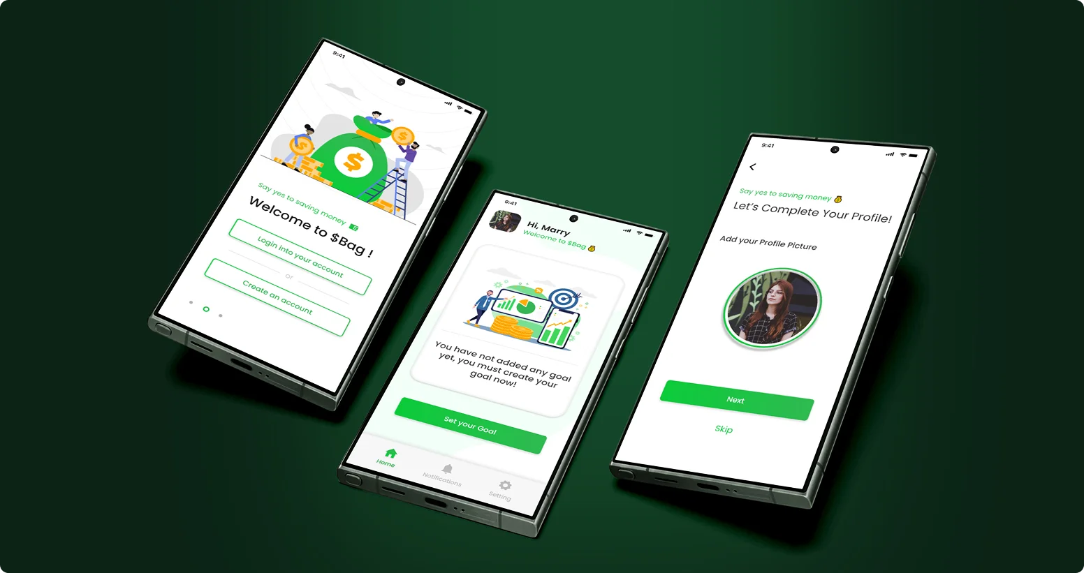 The Bag Wallet App is a smart savings and financial discipline mobile application designed to help users build consistent saving habits through structured plans and gamified experiences. The UI/UX is crafted with a clean and friendly design approach, using a green-centric color palette to symbolize growth, money, and financial stability. The interface is simple, intuitive, and visually engaging, ensuring that users can easily navigate through onboarding, goal setting, and daily saving activities without feeling overwhelmed.