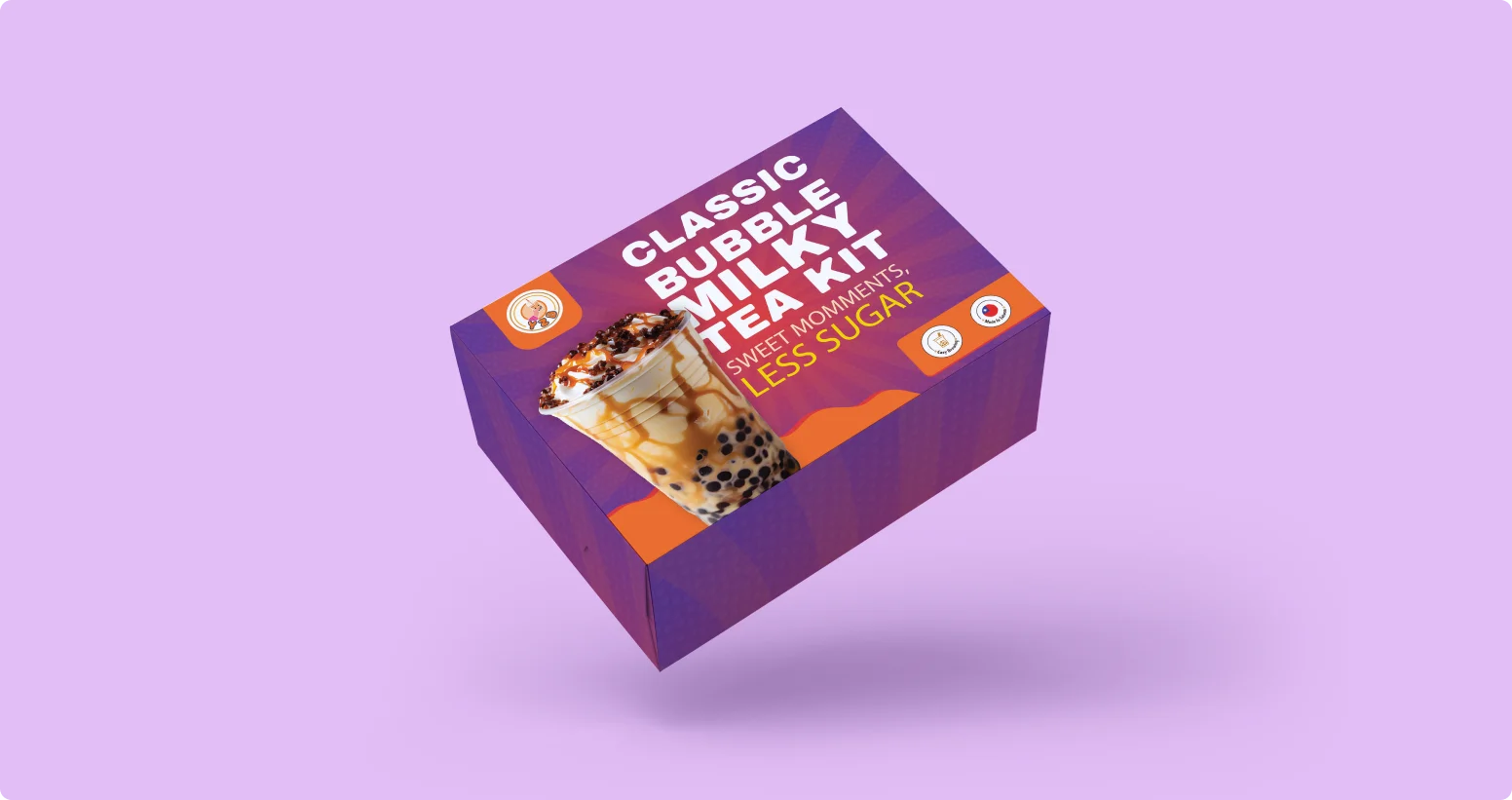 The Classic Bubble Milky Tea Kit packaging was designed to capture the fun, vibrant, and indulgent nature of bubble tea culture while maintaining a modern and eye-catching retail presence. The concept focuses on creating a lively and appetizing visual experience that reflects the sweet, refreshing appeal of the drink.