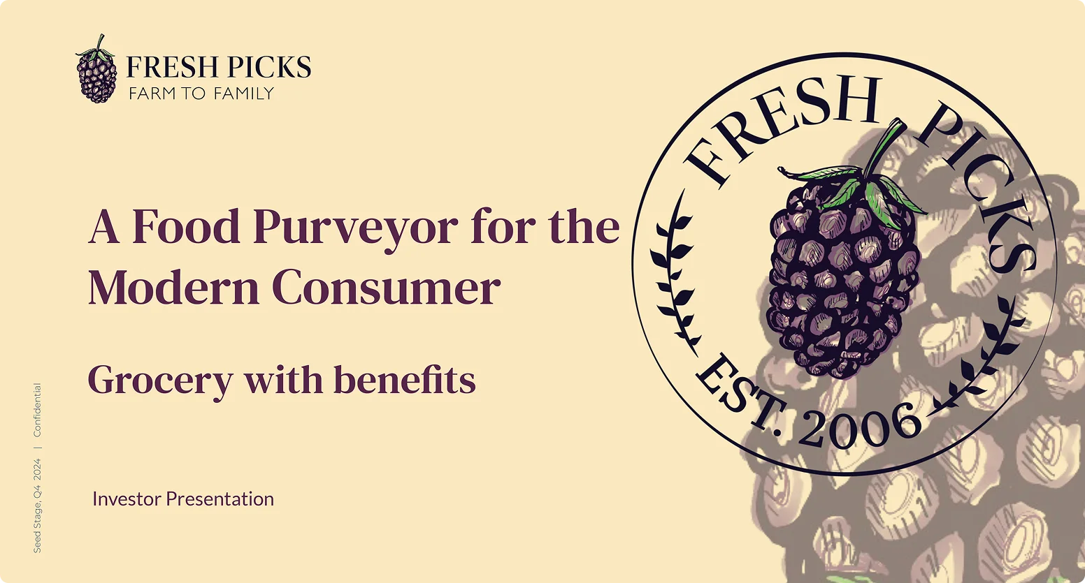 Fresh Picks Pitch Deck, our team focused on designing a presentation that clearly communicates the brand’s mission to transform the modern grocery system. Fresh Picks is positioned as a food purveyor for the modern consumer, delivering healthier, curated, and convenient grocery solutions while supporting local farmers and sustainable food systems. Our goal was to translate this powerful vision into a visually compelling deck that resonates with investors.