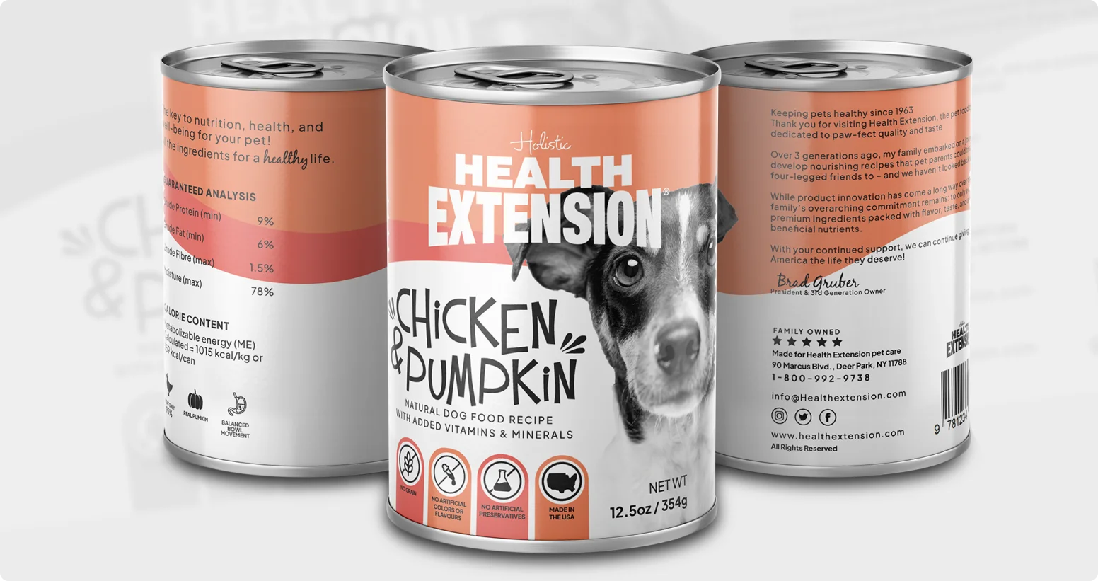 The Health Extension Chicken & Pumpkin Dog Food packaging was designed to communicate trust, nutrition, and care for pets while maintaining a clean and professional retail appearance. The goal of the design was to create packaging that instantly conveys quality ingredients and holistic pet health, helping pet owners feel confident about the food they are choosing for their dogs.