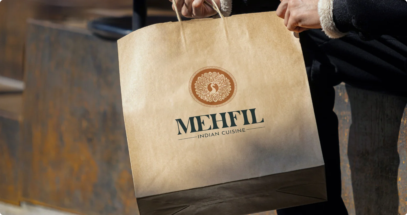The Mehfil Indian Cuisine logo was designed to reflect the richness, tradition, and cultural elegance of Indian dining. The central emblem draws inspiration from traditional Indian decorative patterns, forming a circular motif that symbolizes hospitality, celebration, and community. At the center of the design is a stylized peacock element, a symbol often associated with Indian culture, beauty, and heritage, helping the brand instantly communicate its cultural roots.
