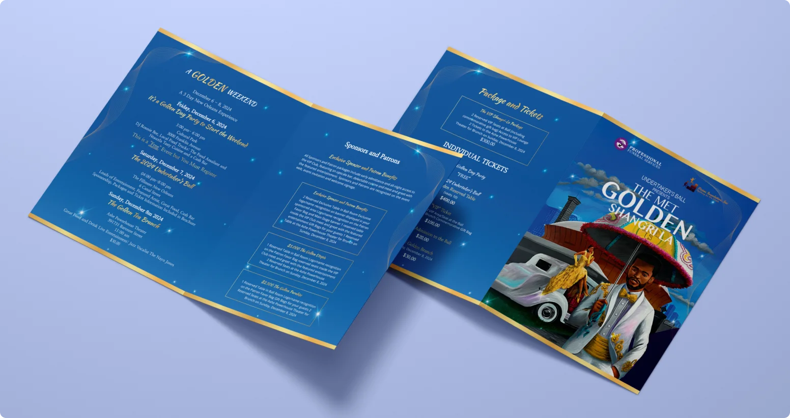The design is built around a royal blue and gold color palette, symbolizing sophistication, luxury, and celebration. Gold accents are used throughout the layout to frame sections, highlight key information, and add a sense of grandeur that aligns with the upscale nature of the event.